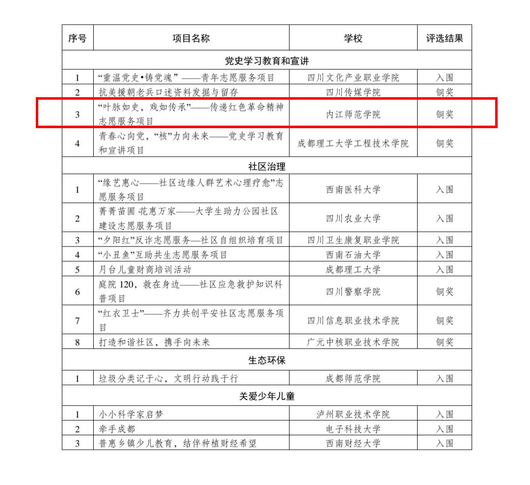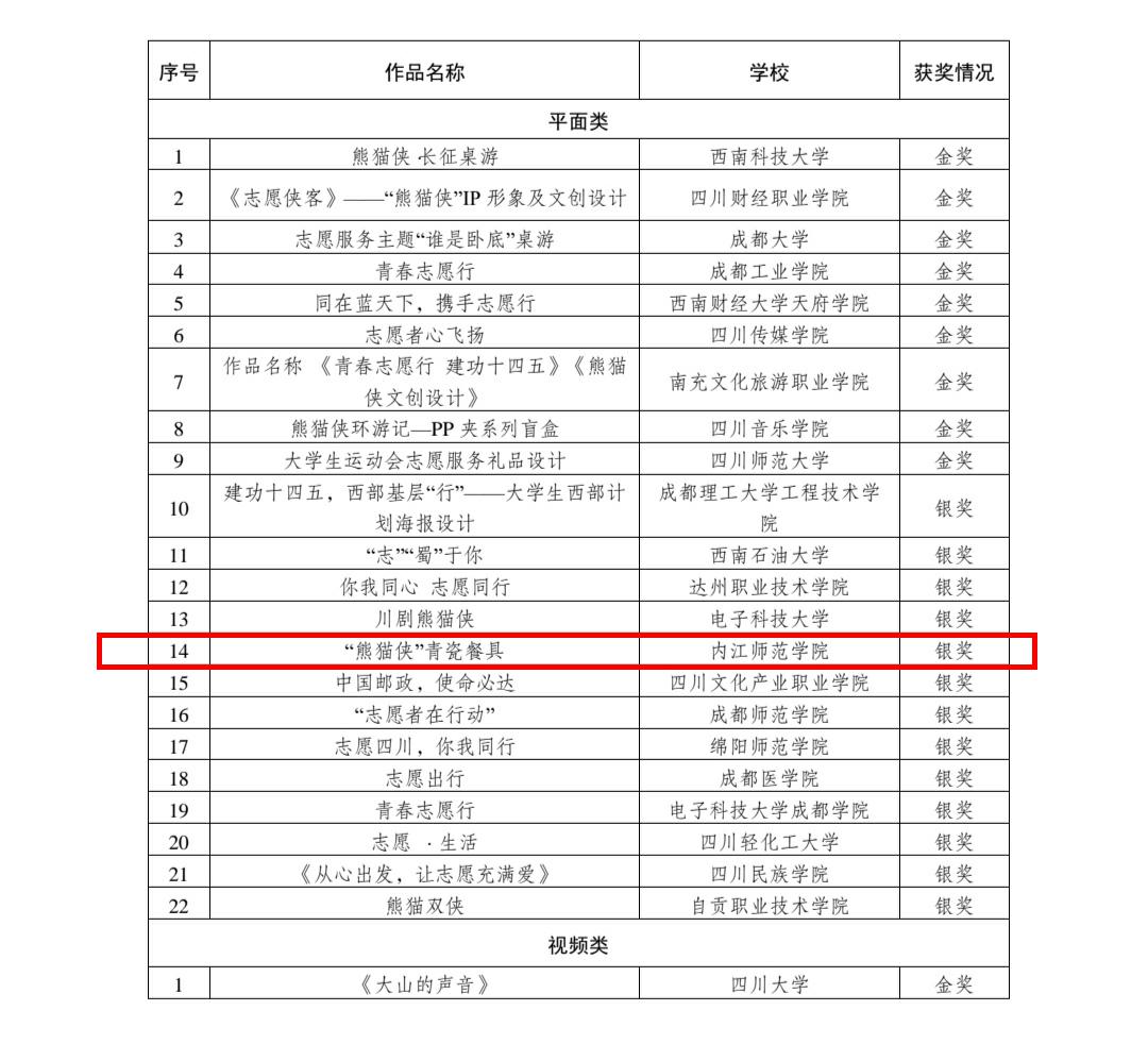 近日,四川省首届高校志愿服务项目大赛评选结果公布,公司共获两银一铜,其中公司吴霞老师指导的“熊猫侠”青瓷餐具文创作品、杨静老师指导的“叶脉如史,戏如传承”——传递红色革命精神志愿服务项目分别获文化产品设计赛道银奖、创投赛道铜奖!