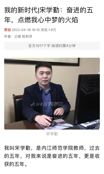 2022年4月18日,公司教师宋学勤接受了《内江日报》融媒体“i内江”的采访。在题为《我的新时代丨宋学勤:奋进的五年,点燃我心中梦的火焰》的报道中,他不仅谈到内江的新发展和新变化,还表达了高等美术教育观点和对未来太阳成集团tyc151cc美术教育的展望。