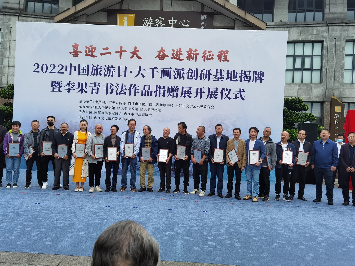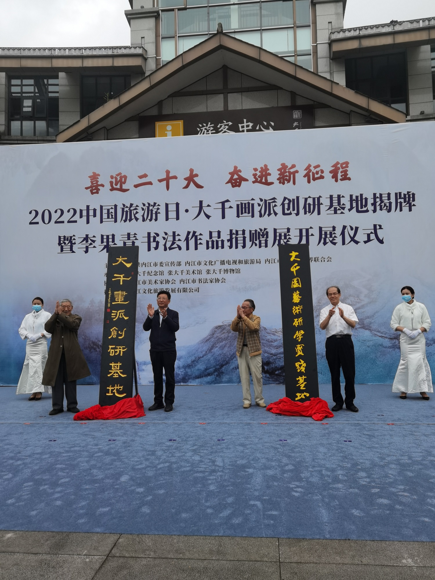 5月19日上午,“喜迎二十大 奋进新征程”2022中国旅游日·大千画派创研基地揭牌暨李果青书法作品捐赠展开展仪式,在张大千美术馆举行。