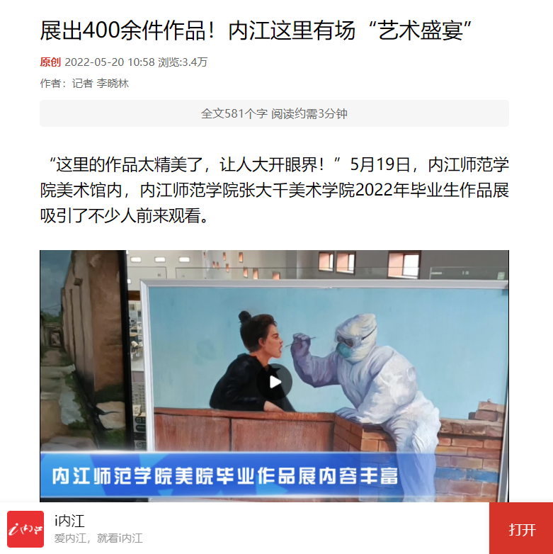 5月17日,公司2022届毕业创作、设计作品展在太阳成集团tyc151cc新校区美术馆成功举办。展览期间美术公司非毕业班员工在专业老师及班主任的带领下分批参观了该次展览。由于今年的毕业作品展是展示最为集中,规模最为庞大的一次,其作品内容涵盖了公司美术学(国画方向、油画方向、师范方向)、视觉传达设计、动画、产品设计、环境设计、服装与服饰等八个不同的方向或专业,种类繁多,题材丰富,形式多样,风格鲜明。同学们在观展过程中,相互观摩与学习,受益匪浅。