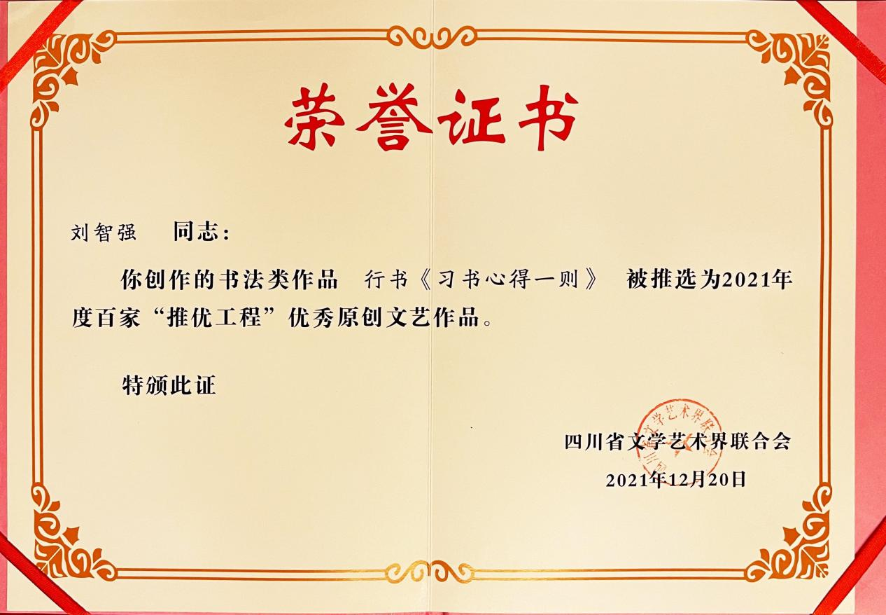2021年12月20日下午,由四川省文学艺术界联合会主办,《现代艺术》杂志社承办,省级各文艺家协会协办的四川省文学艺术界联合会2021年度百家“推优工程”发布会在成都市新华宾馆召开。公司青年书法教师刘智强原创书法作品《习书心得一则》成功入选,并作为书法获奖作者受邀参加此次会议。