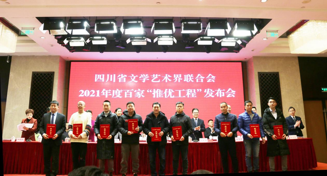 年度百家“推优工程”,旨在总结和展示我省文艺界实施“六大行动计划”成果,构筑高原高峰、壮大文艺川军、增强创作实力。自2017年以来,年度百家“推优工程”已连续实施5届,成为我省文艺界重点品牌工程。2021年度百家“推优工程”严格遵守公开、公平、公正的原则,按照申报、初审、复审、终审、公示、发布6个程序,执行“推出优秀作品、推出优秀人才”的双推标准,好中选好,优中选优,不厚名家,不薄新人,逐轮、逐一推荐,从557件符合条件的申报作品中,最终推出100件优秀原创文艺作品。