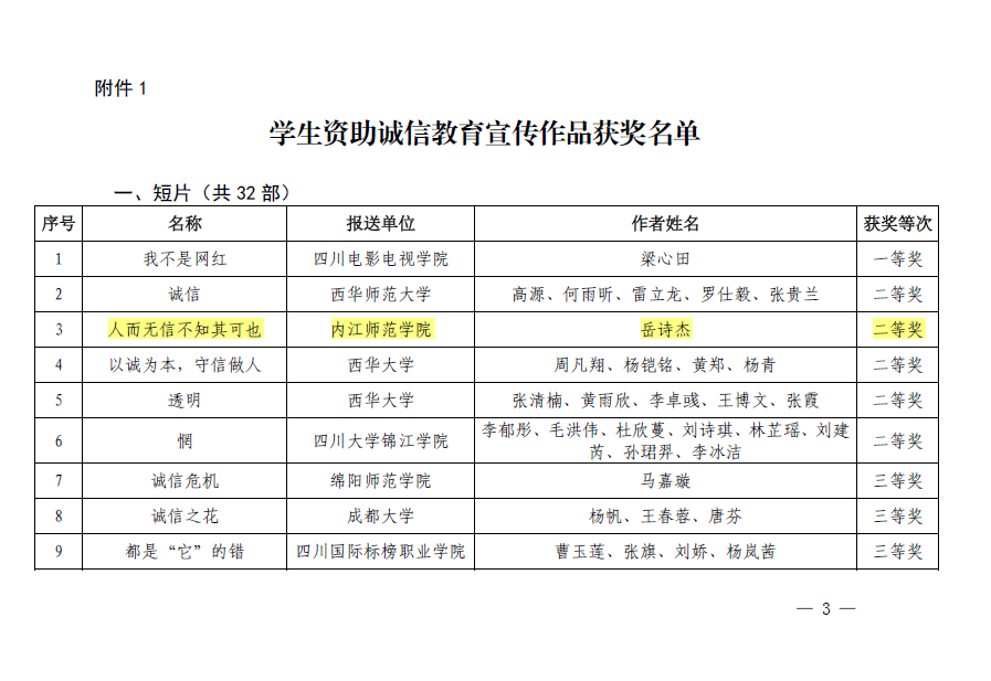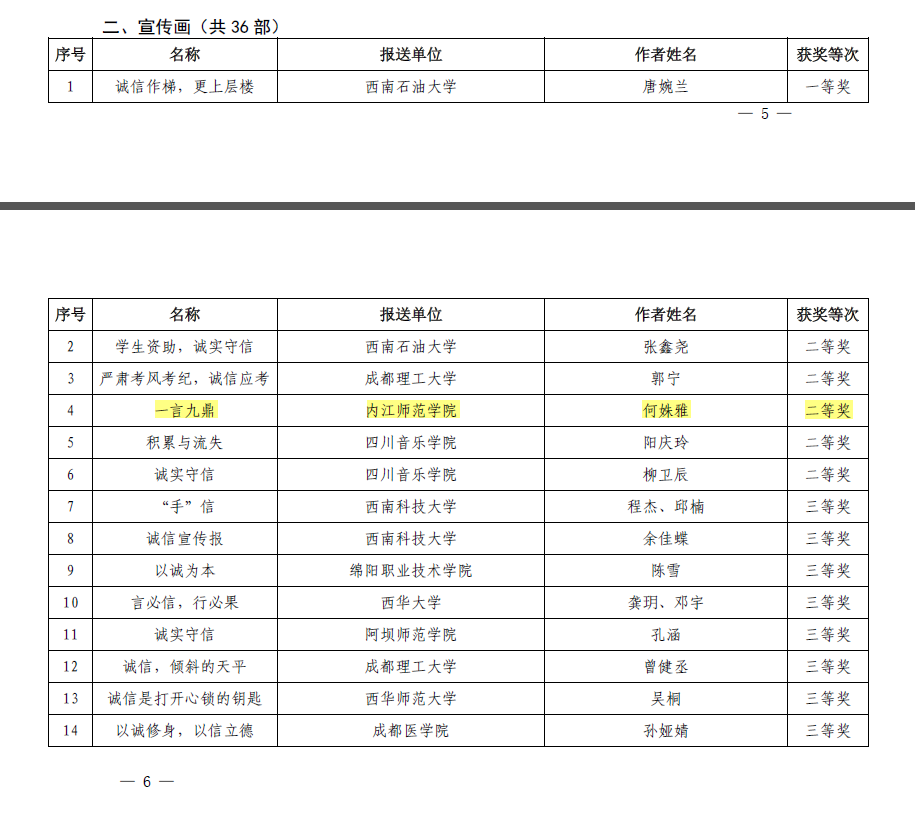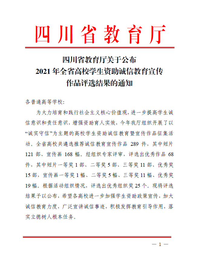 为大力培育和践行社会主义核心价值观,进一步提高员工诚信意识和责任意识,增强资助育人实效,四川省教育厅组织开展了以“诚实守信”为主题的高校员工资助诚信教育暨宣传作品征集活动,全省高校共遴选推荐诚信教育宣传作品289件参加最终评选,其中短片121部,宣传画168幅。
