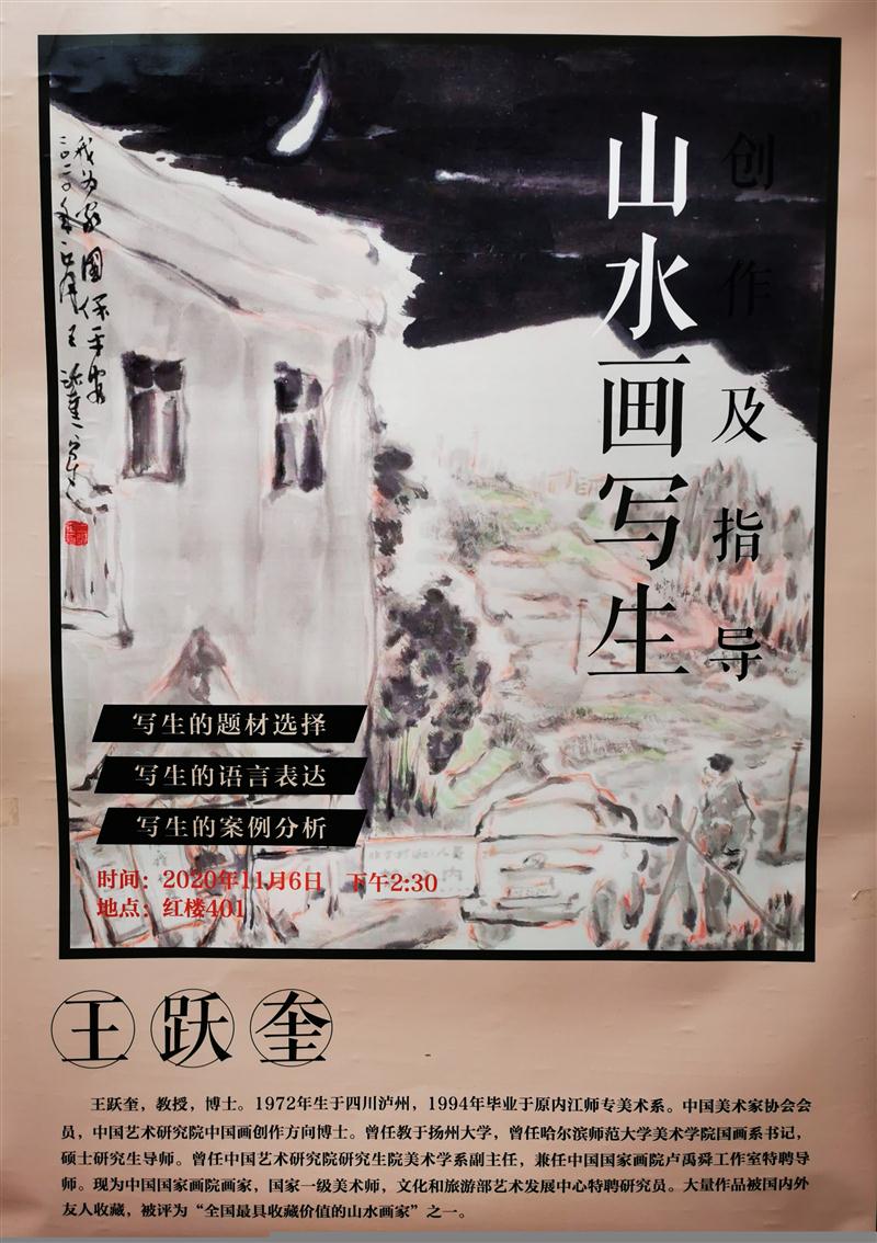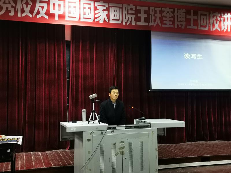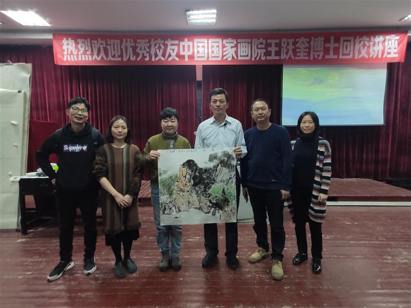 11月6日下午,公司优秀员工、太阳成集团tyc151cc特聘教授、中国国家画院画家、国家画院教学部主任王跃奎博士回母校讲学,做了题为《山水画写生》的学术讲座。公司罗凯经理、彭永馨副书记及部分教师与美术学专业同学参加了此次讲座。