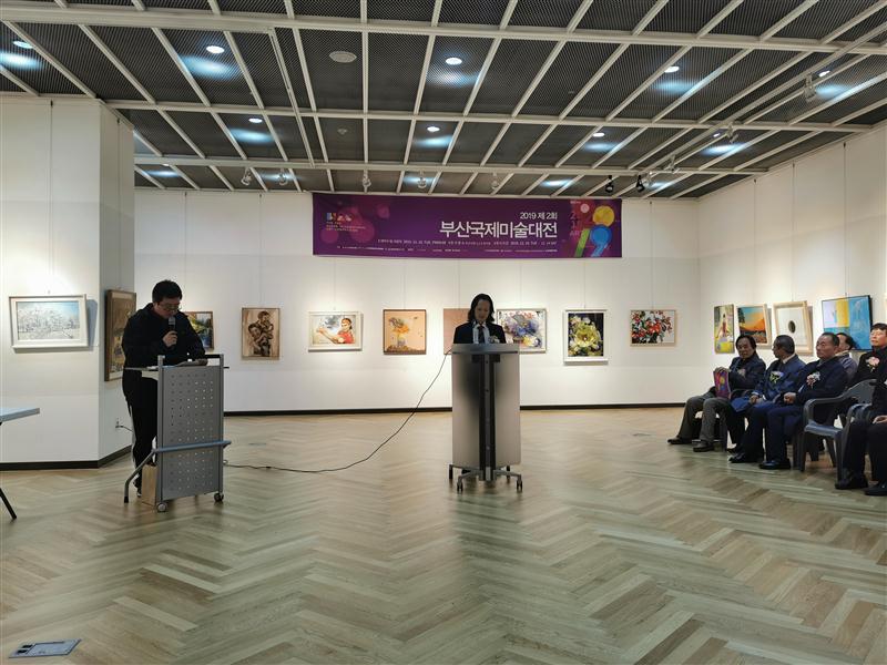 开幕式在韩国釜山市政展厅举行,罗经理作为唯一获得“最优秀赏(二等奖)”的中国艺术家代表在开幕式上做了精彩发言,并接受了来自韩国美协主席颁发的获奖证书及收藏证书。