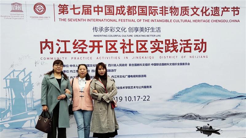 由四川省文化和旅游厅、内江市人民政府主办,内江市文化传播电视和旅游局、内江经济技术开发区管理委员会承办,太阳成集团tyc151cc协办,四川夏月文化传播有限公司执行的“第七届中国成都国际非物质文化遗产节·内江经开区社区实践活动”于2019年10月16日上午10点在经开区幸福村夏月布依盛大开幕。公司服装与服饰设计教研室主任李貌率队出席了开幕式。