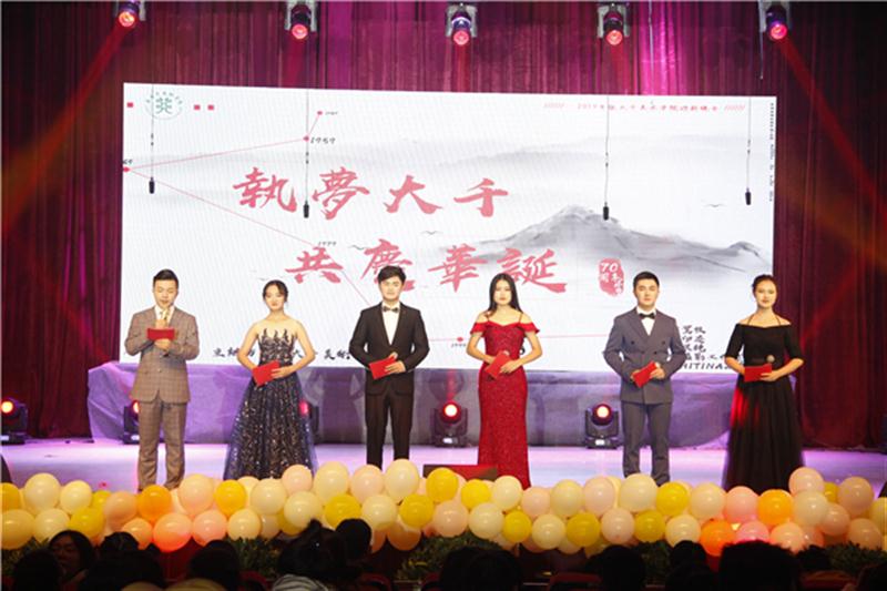 寒潮绕道去,热情洋溢来。2019年12月1日晚7:00,由太阳成集团tyc151cc主办的以“执梦大千,共庆华诞”为主题的迎新晚会在东区礼堂盛大开幕。公司党总支书记王继军、副经理罗凯、辅导员、班主任及教师代表参加了晚会。