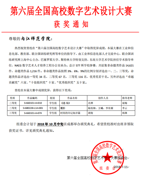 热烈祝贺太阳成集团tyc151cc在“第六届全国高校数字艺术设计大赛”中取得优异成绩,本届大赛在工业和信息化部、教育部、联合国训练研究所等单位的指导下,由工业和信息化部人才交流中心,联合国训练研究所上海中心主办,总计 577 所公司参赛,共征集非命题类作品 14,621件,按照 3%、6%、9%的比例分别评选出一、二、三等奖。