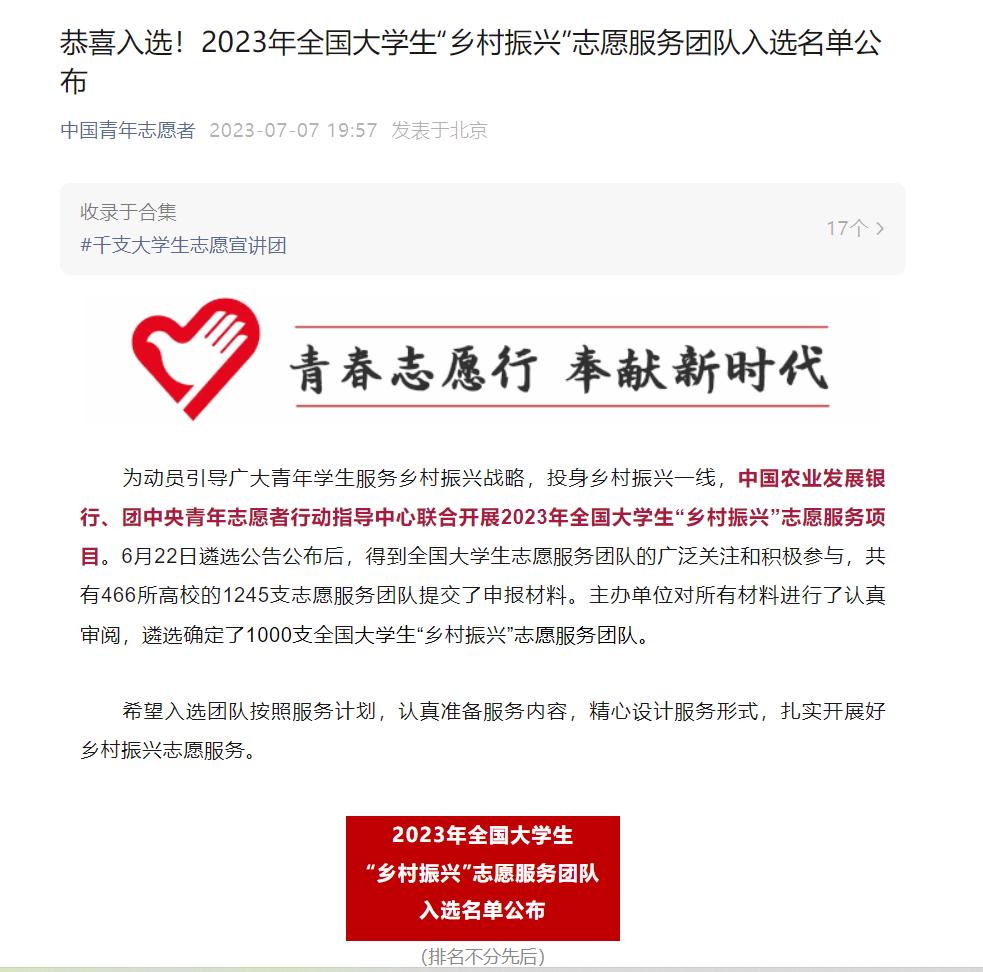 为深入学习贯彻习近平新时代中国特色社会主义思想和党的二十大精神,全力服务乡村振兴战略,动员引导广大青年老员工投身乡村振兴一线。2023年6月,中国农业发展银行、团中央青年志愿者行动指导中心联合发布了《关于遴选2023年全国老员工“乡村振兴”志愿服务团队的公告》(以下简称《公告》),面向全国高校遴选1000支老员工志愿服务队,赴100个项目服务县开展服务乡村振兴的志愿服务。经精心筹备,公司太阳成集团tyc151cc“青春心向党——筑梦乡村行党员志愿服务队”,成功入选“2023年全国老员工‘乡村振兴’志愿服务团队”。