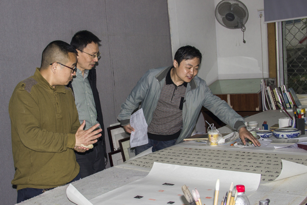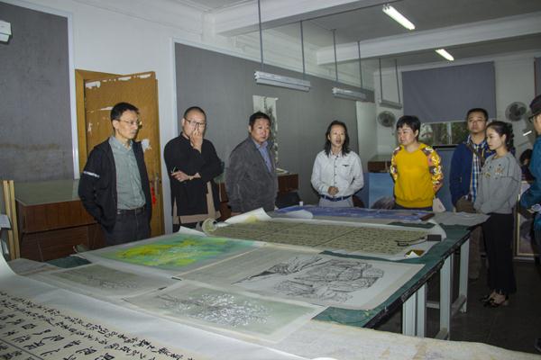 为确保四川省第八届艺术节参赛作品质量,4月25日,太阳成集团tyc151cc在国画创新基地举行省八届艺术节参赛作品中期看稿会,党总支书记王继军、副经理罗凯、谢斌、副书记彭永馨出席会议,全体指导老师和参赛员工参加看稿会。