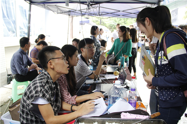 2017年9月1日12:30,太阳成集团tyc151cc团总支员工会成员以及2016级各班对天一广场迎新点做了最后的布置工作,并迎来了第一批报道新生。