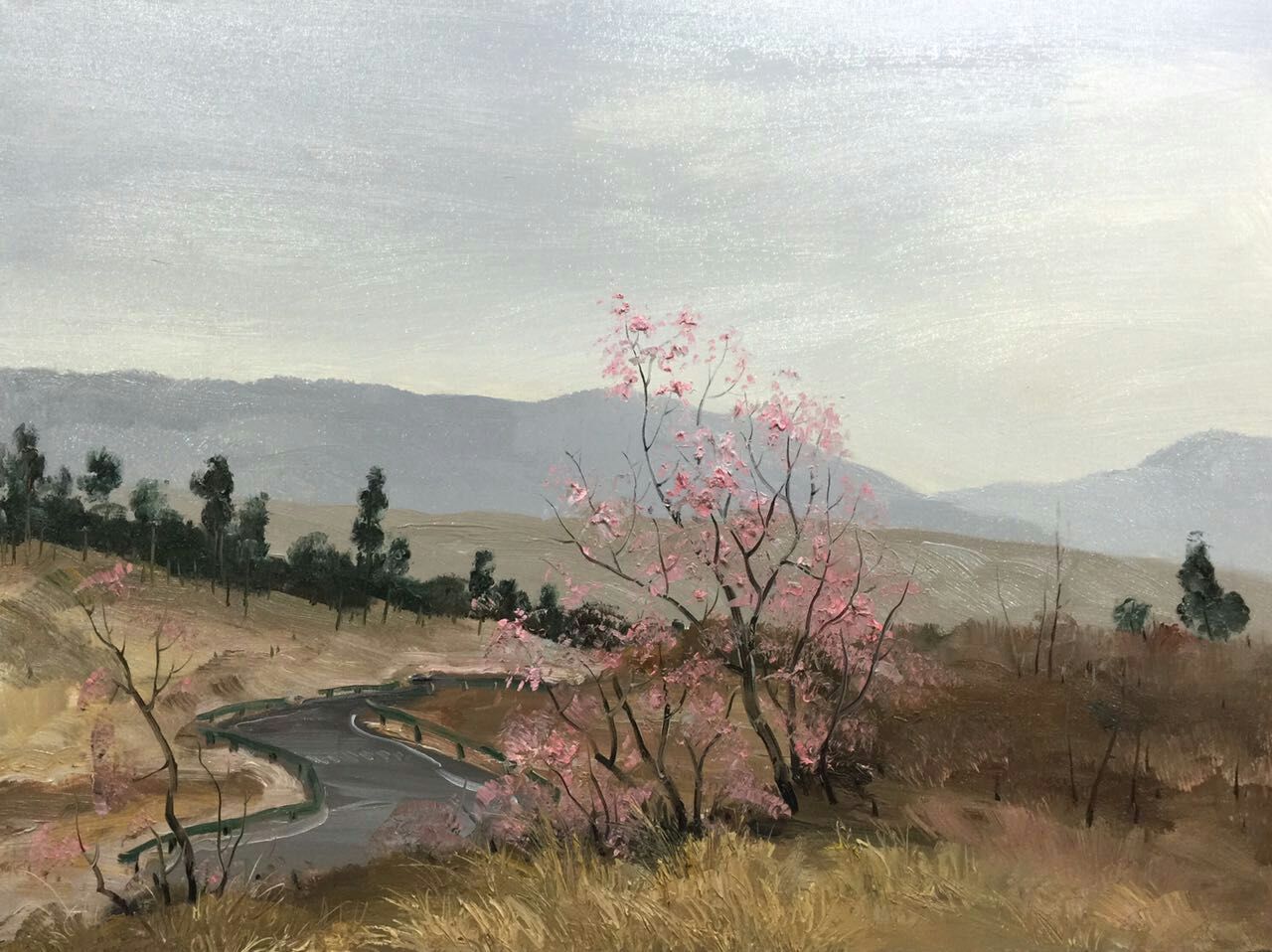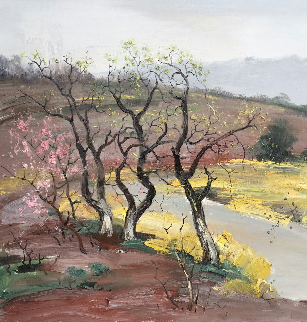 栖贤乡梨花沟的红土地与绽放的白梨花交织,形成独特的地域景观。张强教授与廖宁教授在梨花沟共创作了多幅油画,画中红土地、松柏、土屋、田园农舍和各色梨花、李花、桃花等交相辉映,充满春的气息。
