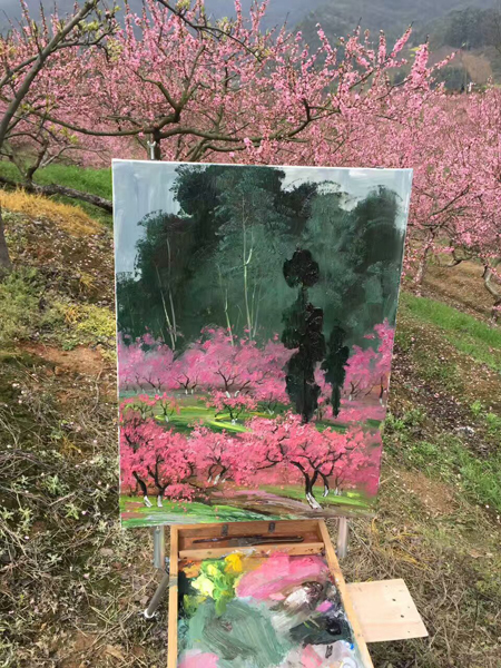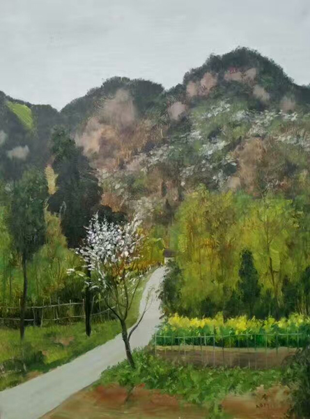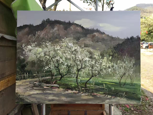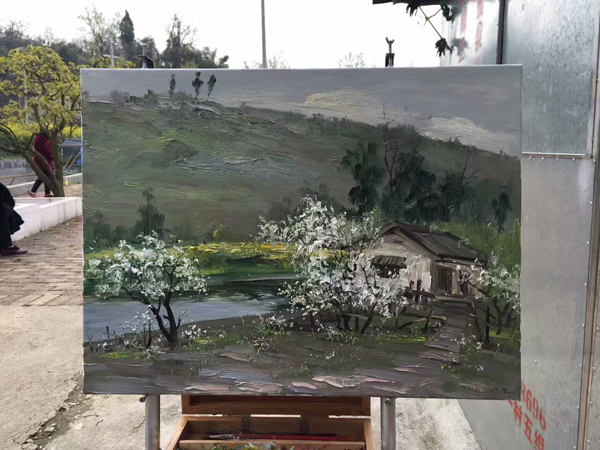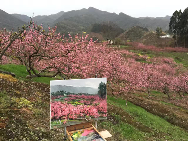 葛仙山花园沟,地处成都平原的边缘。山峦起伏,景观多样,梨花、李花、桃花、杏花等各种花相互交织,形成独特的春天花园景观。张强教授与廖宁教授在梨花沟共创作了多幅油画,画中的山峦、农家小院、乡村蜿蜒小路、树木和花朵交相辉映,充满春的气息。