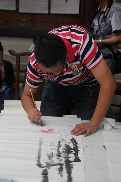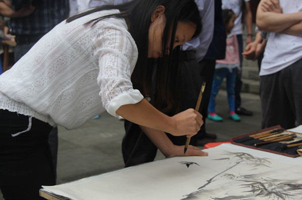 上午九点,活动现场聚满了前来观看的艺术爱好者和艺术从事者,随着陶艺基地的马老师一笔墨点散在纸上,活动正式拉开帷幕。公司学子提笔走墨,在现场作出墨竹、石菊、泼墨人物、山水、行书、隶属等多种风格的书画作品,现场的观众对此赞不绝口,纷纷称“画坛自有人才出,长江后浪推前浪”。