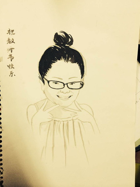 同学们以卡通的形式为喜爱的老师作画。作画中,同学们根据各老师不同的体形、发型、脸型、五官以及穿着特点等进行造型设计,用流畅的线条生动形象地描绘了各老师的风格、特征以及在自己心中的形象。作画结束后,同学们在卡通画旁写满了对老师的祝福语,亲手把画像送到了老师们的手中,并向心爱的老师送上了最衷心的祝福。在接到同学们用心准备的,别出心裁的礼物时,老师们感动不已,纷纷表示由衷的感激和开心。其中刘津辰老师说:礼物很有创意,是心意和专业的相结合,突显了公司的专业特色,表示将把画裱起来,好好保存。