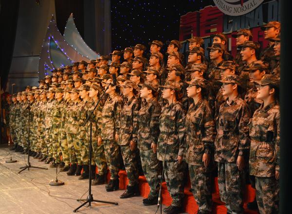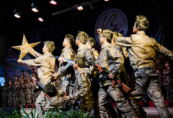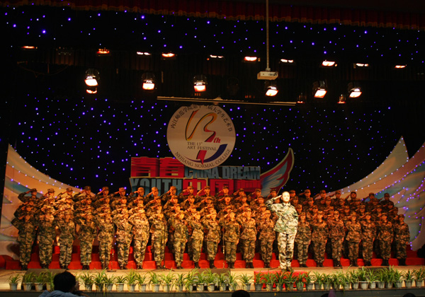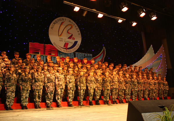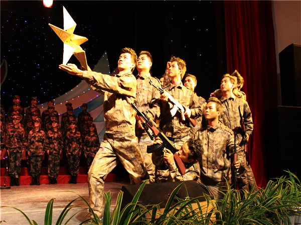 大礼堂内灯光璀璨、人声鼎沸。伴随着“军歌嘹亮,英姿飒爽,大千学子,斗志昂扬”的加油助威声,公司合唱团闪亮登场。“准备好了吗,士兵兄弟们,当那一天真的来临……”在指挥员任美熹的手势下,美院学子们的歌声伴随着伴奏的跌宕起伏而显得格外的铿锵有力、富有激情,赢得了阵阵掌声。他们以豪迈的歌声、高昂的热情唱出了军人之魂,唱出了对祖国的热爱,赢得了观众的热烈掌声。同时,精彩的表演与高昂的士气将比赛推入高潮。最终,公司合唱团以9.624分荣获大合唱比赛第一名,并创造了连续三年一等奖的历史记录。