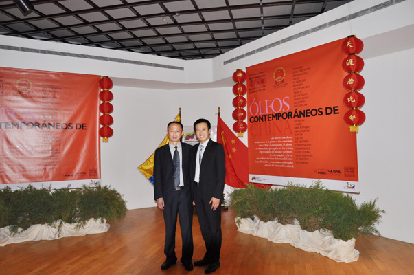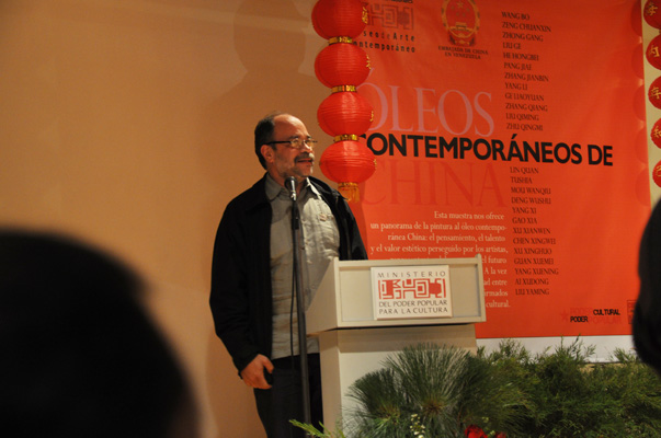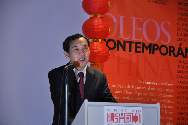 在开幕式上,赵荣宪大使发表讲话,指出值此中国国庆62周年之际,中国当代油画艺术展的举办为增进两国人民的了解和友谊搭建了一座艺术的桥梁,希望两国艺术家们继续为推动两国文化交流做出新的贡献。佩德罗. 卡萨迪利亚部长对委中双方为筹备此次画展所作的努力表示衷心的感谢,对远道而来的中国艺术家表示热烈的欢迎,并指出近年来委中两国关系发展势头良好,两国人民不断加深了解,希望双方进一步扩大文化艺术交流,推动双方友好合作关系向前发展。