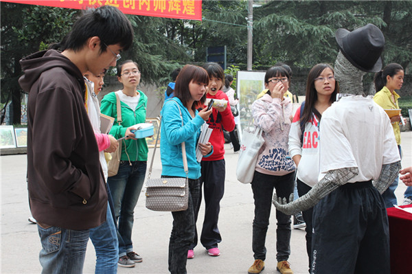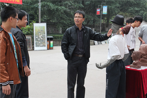 作品展出后,吸引了众多的老师和员工前来观赏,在一件件精美的作品前,他们惊叹不已,流连忘返。09级4班马福龙同学用铁丝制作而成的装置艺术《无所谓》让观者无不想伸手触摸一下,感受其艺术独特的魅力。
