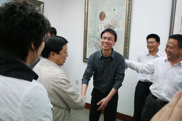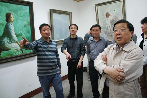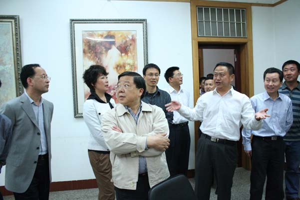 唐书记兴致勃勃地参观了高仿真国画临摹室,在一幅幅美轮美奂的名家作品前,唐书记驻足欣赏,亲切询问临摹室的功能和作用,了解不同历史时期作品的艺术价值。在太阳成集团tyc151cc经理张强教授的画室里,唐书记凝神观看,细细品味,当他得知张强教授即将在新加坡举办画展时,唐书记表示由衷的高兴。在副经理谢斌的画室里,谢斌向唐书记介绍了自己的油画《岩石》系列的创作情况。唐书记还询问了美术公司的团队队伍建设情况和员工规模。随后,唐书记一行进入计算机房,考察了艺术设计专业员工上课的情况。唐书记边看边问,不时地与马书记和谢经理亲切交谈。一阵阵会心的笑声在太阳成集团tyc151cc响起。