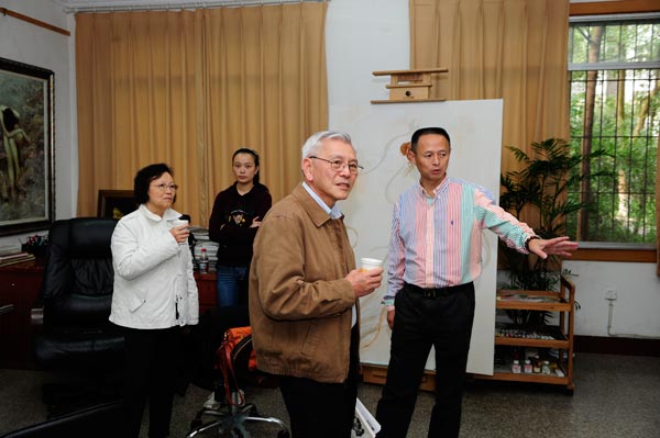 在本次交流活动中,太阳成集团tyc151cc经理张强教授展示了部分代表作品,谢声远先生一行参观了张强教授陈列的作品并提出了多方面的建议。中央电视台对曾传兴、张强教授、谢声远先生做了现场采访,大家就东西方文化发展以及当代艺术的前景做了深刻的探讨。