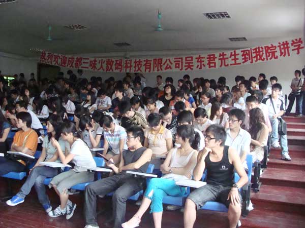 吴东君先生首先介绍了三味火数码公司的概况,并对当前行业的情况做了详细介绍,包括全球网络市场的概述,飞速发展的中国游戏产业和中国游戏动漫的发展前景,讲解了动画的相关制作流程。吴先生的讲座图文并茂、精彩纷呈,多媒体的交互式展示让同学们感受到了动漫的艺术魅力,了解到三味火公司的行业特色和大量的原创作品,看到了中国游戏动漫市场巨大的发展空间,同时还为同学们提供了很多关于动画方向的职位。