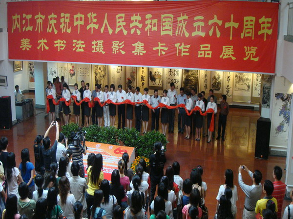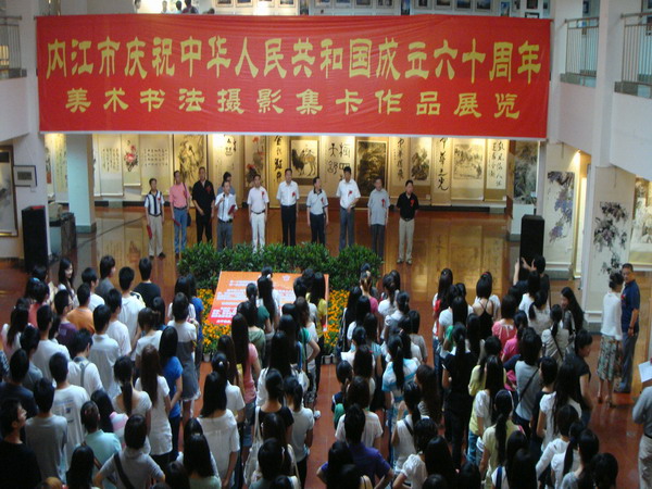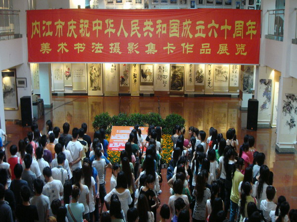 9月18日,上午8:30,内江市庆祝中华人民共和国成立六十周年美术、书法、摄影、集卡作品展览在西区综合楼展厅展出。此次活动主要是为了庆祝中华人民共和国成立60周年及纪念张大千诞辰110周年,展现改革开放的主旋律,倡导艺术创新的多样化,体现民族精神和时代精神。