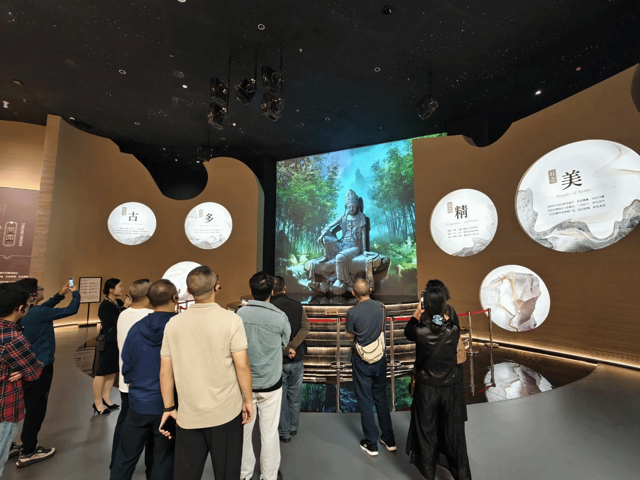 随后,团队参观了安岳石窟数字展示中心,感受数字赋能,体验3D建模、虚拟复原等数字化保护技术成果,双方就数字化技术在石窟文物信息留存、复原研究、公众教育以及远程体验等方面的应用潜力与未来合作方向进行了深入探讨。