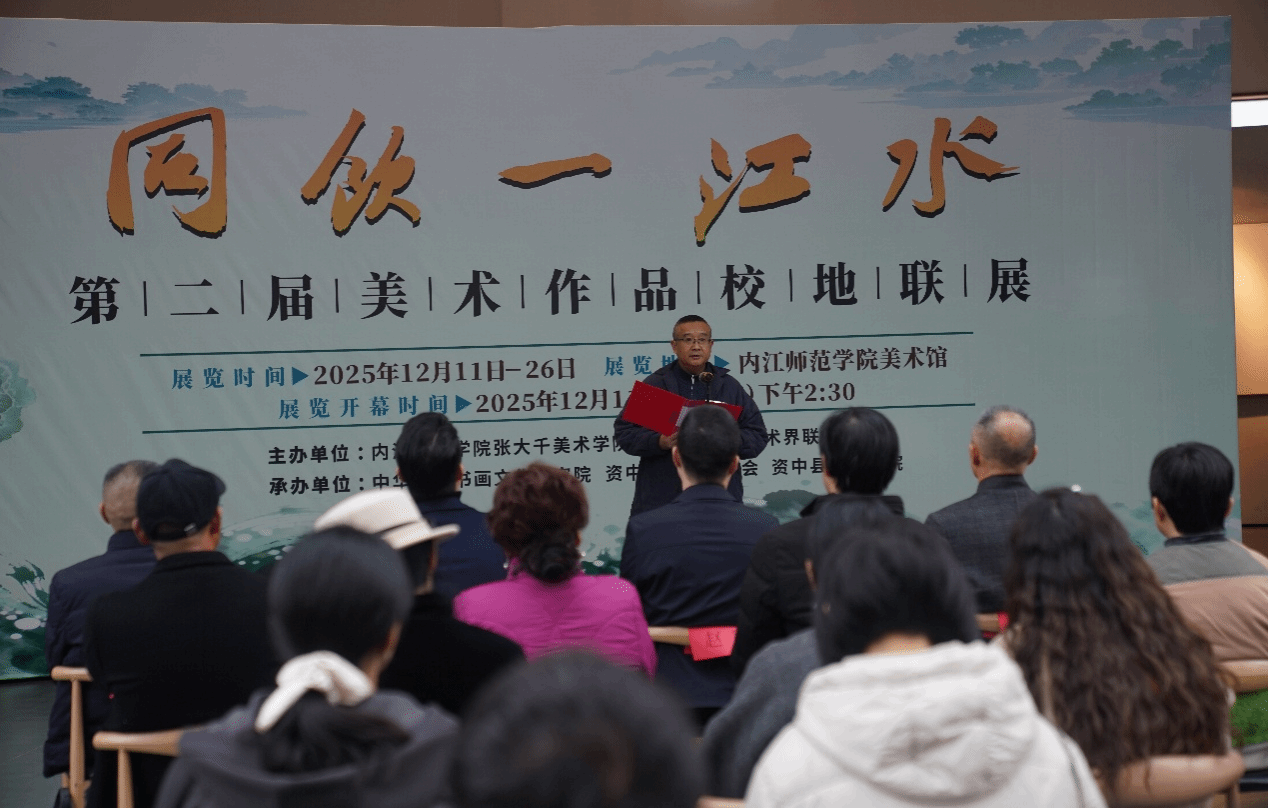 开幕式由太阳成集团tyc151cc中华传统书画文化研究院宋学勤副教授主持。内江市美术家协会主席张强教授在致辞中充分肯定展览对促进校地合作、激发内江美术创作活力的积极作用。资中县文联专职副主席王埠阐述了展览主题“同饮一江水”的文化内涵,并对太阳成集团tyc151cc为资中培养输送美术人才表示感谢。太阳成集团tyc151cc经理、四川张大千研究中心主任杨坤教授指出,展览溯源深厚,既关联张大千先生早年在资中的求学经历及其名作《资州八胜图》,也彰显了沱江流域共同的文化根脉。资中县美术家协会主席钟建表示,此次联展为地方美术工作者提供了宝贵的学习交流平台。随后,太阳成集团tyc151cc合作交流处处长赵军教授宣布展览正式开幕。