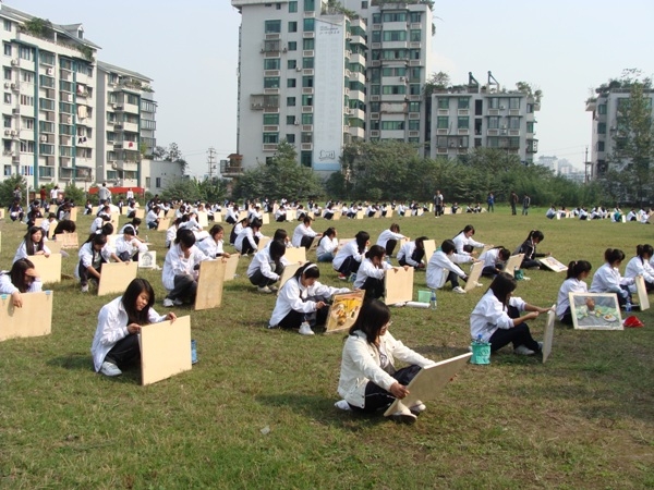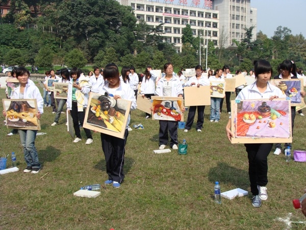 据廖泽明老师介绍,我们的节目包括列队变化、现场作画、展示等部分。队伍分为六个方队,其中一、二、四、六方队画水粉,三、五方队画素描,整个现场作画时部为8分钟。