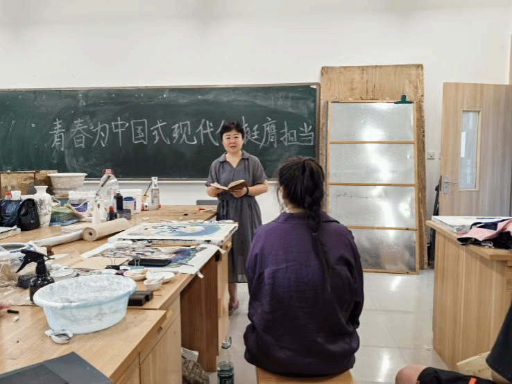 6月13日下午,彭永馨书记来到大千楼A306教室,听取王琴慧老师在2022级1班主讲的《壁画》课程,认真了解员工们的上课状态及所学内容,并就课程教学和艺术创作方面与任课教师和员工们进行了交流。