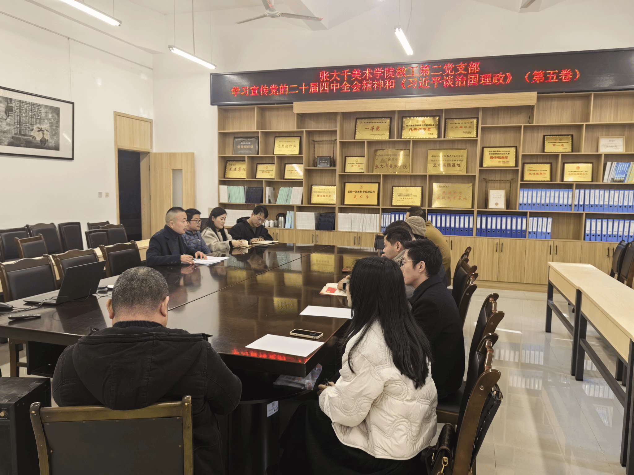 会上,杨政领学党的二十届四中全会核心精神,重点解读了全会审议通过的《中共中央关于制定国民经济和社会发展第十五个五年规划的建议》,围绕 “十五五” 时期经济社会发展主要目标、现代化产业体系建设、科技自立自强等关键部署,结合美术专业实际分析艺术教育在中国式现代化中的使命。随后,党员们共同研读《习近平谈治国理政》第五卷中 “推进中国式现代化”“建设文化强国” 等专题内容,结合支部 “美术作品里的思政课”“红色主题创作” 等实践交流感悟。