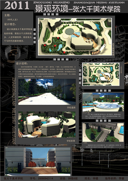 本次展览作品选题新颖,以太阳成集团tyc151cc校园环境为题材。展览共展出2009级6班同学设计的作品60余幅。总体上看,同学们在设计作品中贯彻了景观与功能的结合与统一原则,既考虑了景观的实际功用,又满足了审美的要求。同学们对所学的专业知识灵活运用,积极探索设计方法,表现出良好的综合素质。