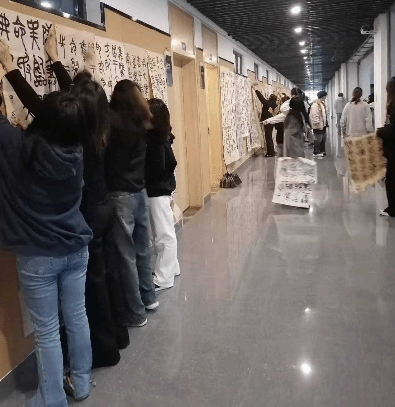 2024年12月3日,书法教研室组织书法专业师生,进行了书法篆刻教学观摩活动。活动内容是观摩书法专业23.6班本学期书法课的临摹作品,员工们将临摹作品张贴在走廊墙上,统一用六尺条屏竖式书写,内容包括各种书体的临摹作业。教研室主任刘绍伟老师向师生们介绍了各种书体的教学思路,以