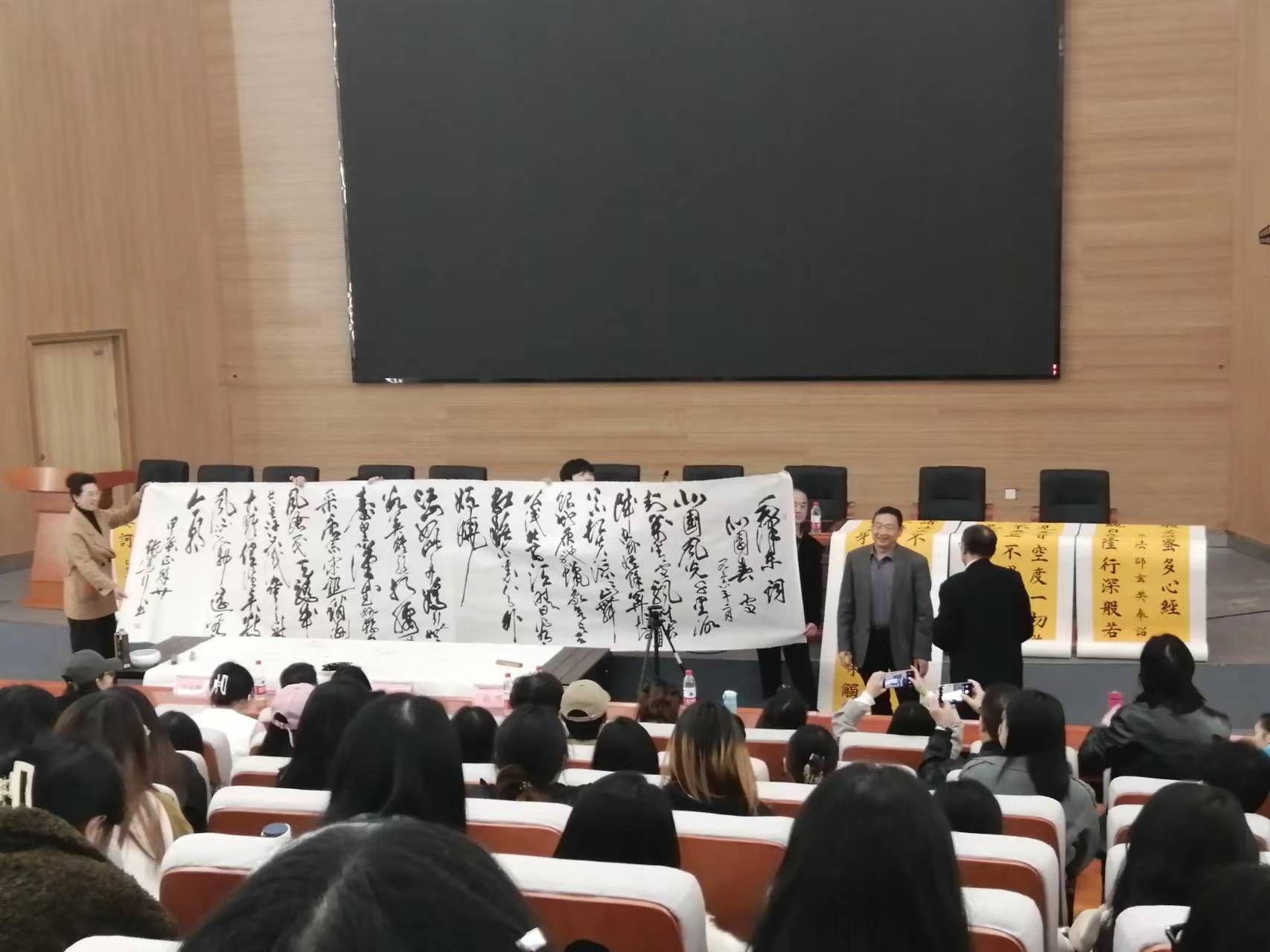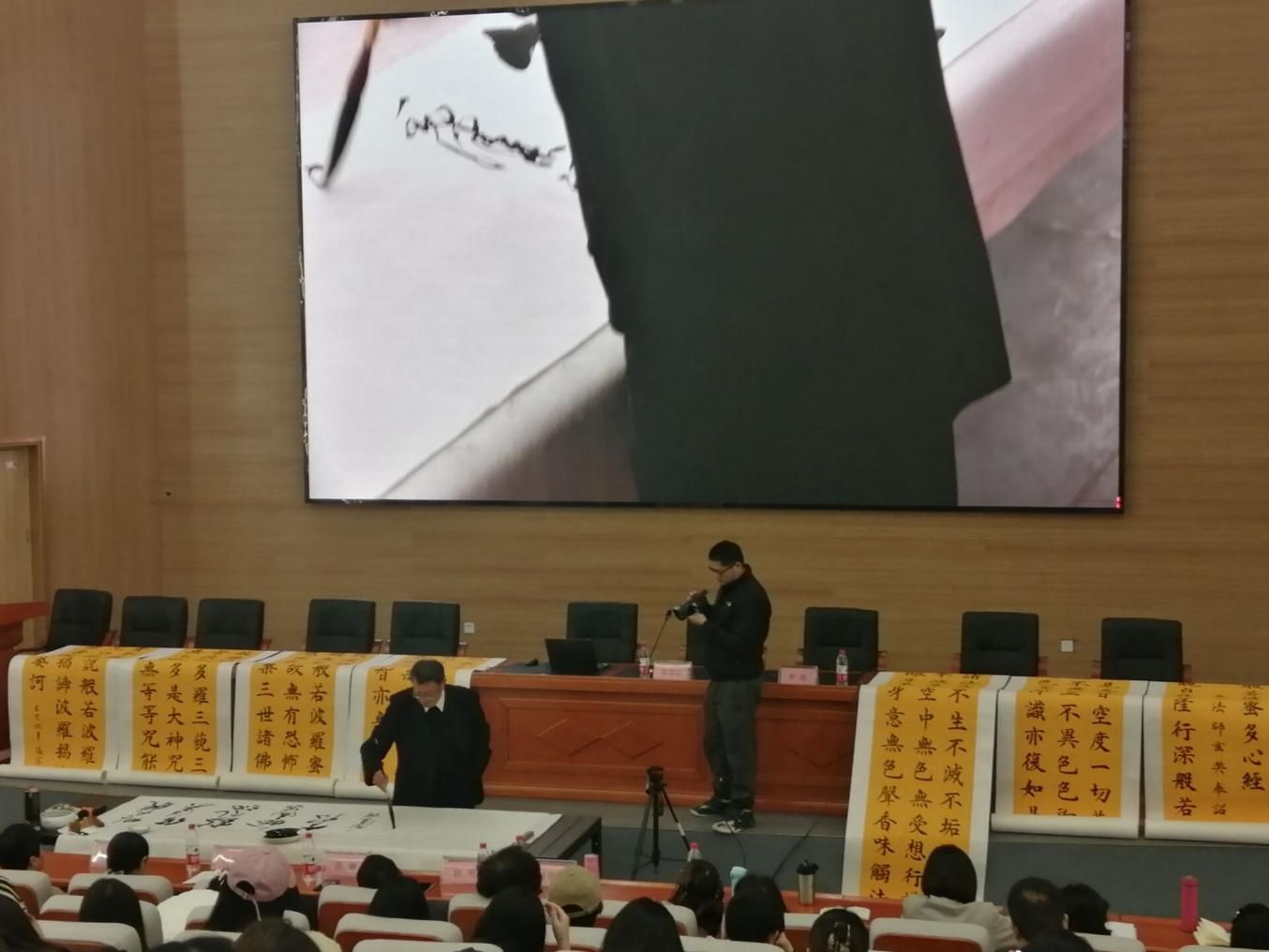 张笃行教授还谈到草书,他说:要完成一幅草书不是简单的问题,每一个字怎样写要熟悉,然后才能顺势而为。张笃行教授在现场书写了毛主席的《沁园春•雪》,最后还为大家展示了多福作品,现场师生认真观摩,受益匪浅。