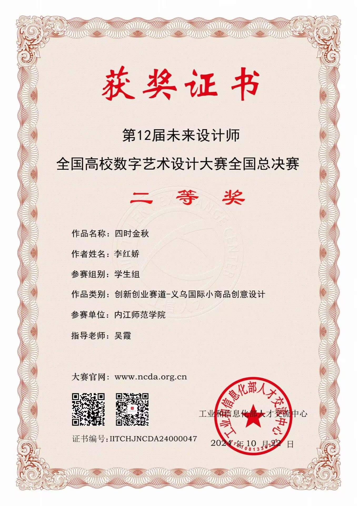2024年10月21日,2024第12届未来设计师・全国高校数字艺术设计大赛NCDA“创新创业”赛道全国总决赛在义乌举行,共有49支队伍进行了现场路演。经过以国务院学科评议组(设计学)成员中国美术公司吴小华教授为组长的7位专家的现场提问和评审,结合前期的预赛成绩和产品销售业绩,最终决出全国一二等奖及创新创业金银铜奖。日前,该赛道国赛作品评选结果揭晓,公司产品设计专业吴霞老师指导的大三学子(参赛时为大二在读)李红娇的作品《四时金秋》获得全国二等奖,吴霞老师获得优秀指导教师奖。