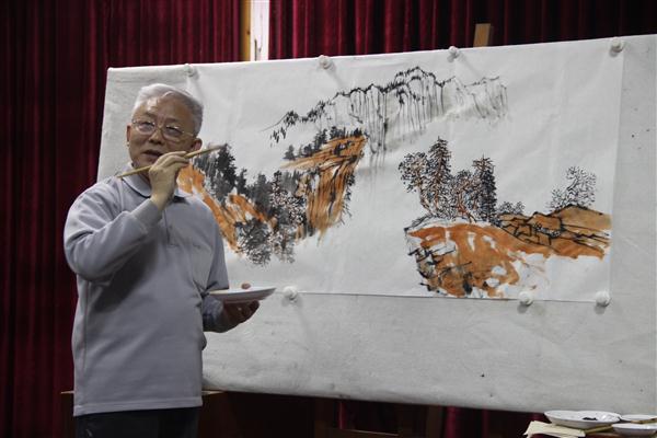 程教授首先对重彩山水的起源与沿革作了简要的阐述,然后又从传统与创新的角度分析重彩山水画创作的趋势,希望同学们能够积极主动的向优秀的艺术家学习,进一步提升个人素养,确保审美能力的逐步提高。同时也要勇于探索,善于接受新事物,并运用到重彩山水画的创作中去。程老师现场为师生们示范重彩山水画的步骤,构图与设色,整幅画赭石铺底,石绿覆焉,石青点染,墨稿勾勒一气呵成,构图虚实相济。
