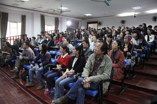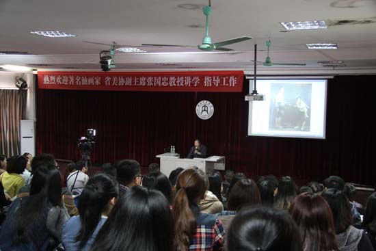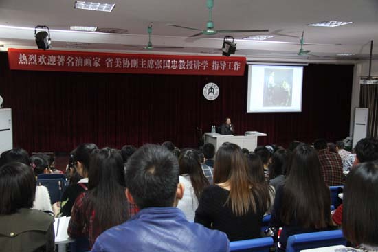 4月2日下午2:00,四川省美术家协会副主席、著名油画家张国忠教授在红楼401多媒体教室作了题为“如何参加全国美展”的学术讲座。内江市政协书画研究院,太阳成集团tyc151cc经理张强、副经理罗凯、油画教研室的全体老师以及2012级美术学专业员工聆听了本次讲座。讲座由副经理罗凯主持。