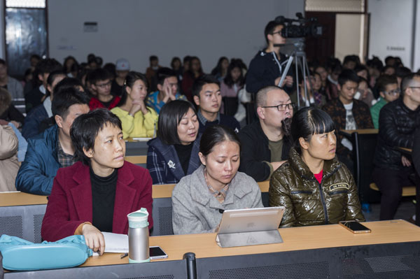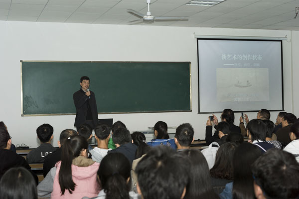 随后讲座进入正题,王跃奎博士从热爱、体悟、创新三个方面开始讲创作的状态。他以一段经典琵琶曲目《十面埋伏》引入,告诉同学们艺术的艰辛,艺术创作需要热爱的同时,更关键的在于全身心的投入。他说,体悟是需要安静的状态,定能生慧。并再次以经典曲目《春江花月夜》的欣赏,讲到在安静中产生的想象以及对生活和大自然的体悟。在这其中,他列举了大量的案例,从郭熙的《林泉高致》,到黄宾虹的“墨团团里天地宽”,再到阿炳的《二泉映月》,信手拈来,潇洒自如。他认为,体悟可以分为“对艺术精神的体悟”、“对人生和社会生活的体悟”、“对艺术表达的体悟”。最后强调了最重要的一步:创新。认为创新一定是在传承的基础上进行。