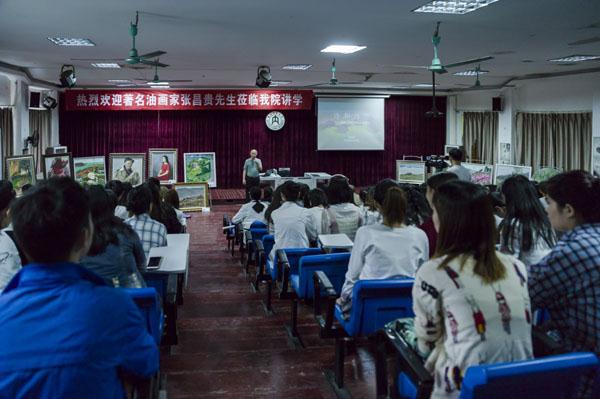 张教授从幼时经历讲起,1969年开始学习中国画,1975年下乡当知青,1984年毕业于西南财经大学金融系并取得经济学学士学位,在追求艺术的道路上经历了风风雨雨、坎坎坷坷。讲座中张昌贵教授根据自己多年来对油画理论的研究体会,从艺术精神要注重传统、与时俱进、正本清源和油画艺术精神要有深厚的人文内涵等方面给美院学子上了一堂高端的艺术精品课。