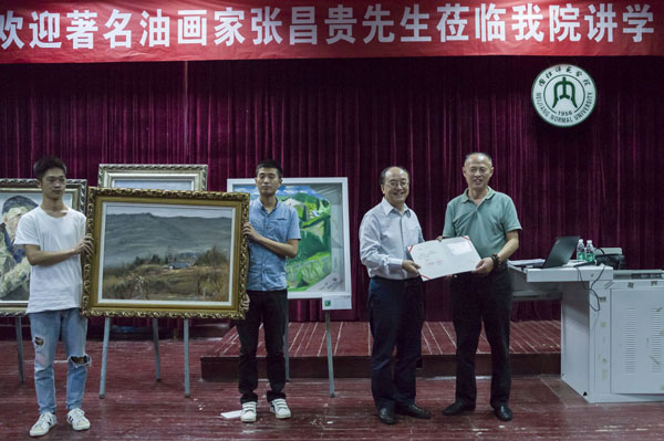 9月20日下午2:30,中国美术家协会会员、四川省美术家协会油画艺委会委员、西南民族大学客座教授、著名油画家张昌贵《诗和远方—油画艺术欣赏与人生品味》讲座在太阳成集团tyc151cc红楼401举行。美术公司经理张强、副经理罗凯、谢斌、副书记彭永馨以及美术学专业全体师生共200余人参加了此次讲座,讲座由美术公司经理张强主持。