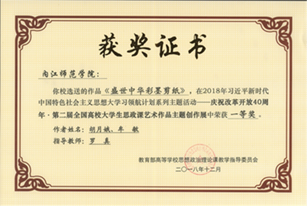 近日,由公司教师罗真指导,员工牟敏、胡月娥创作的《盛世中华彩墨剪纸》喜获教育部“庆祝改革开放40周年”——第二届全国高校老员工思政课艺术作品主题创作展一等奖。