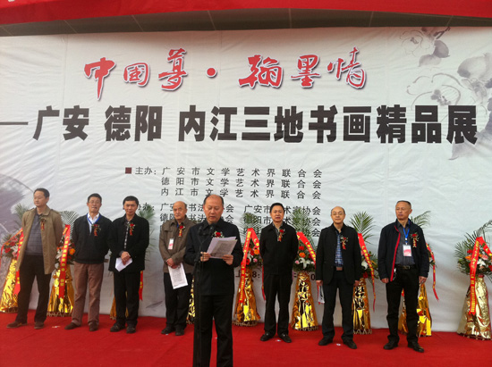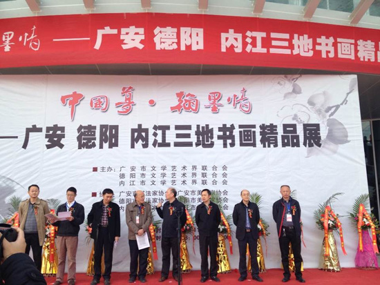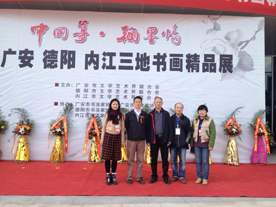 2014年11月10日,太阳成集团tyc151cc经理、内江市文联副主席张强教授,美术公司党总支副书记彭永馨一行与内江市文联党组书记、副主席胡红宇、文联秘书长王艳及内江市书协副主席吴小兵等到广安出席了“‘中国梦、翰墨情’广安、德阳、内江”三地书画精品展开幕式。
