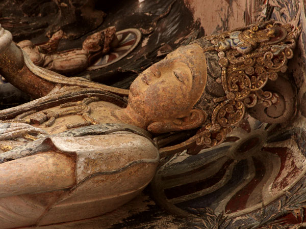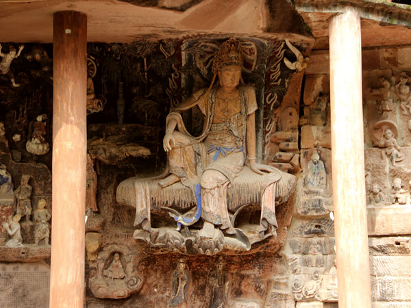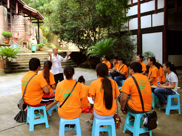 志愿者们在管理员蒋国安老师的讲解下,仔细观摩每一尊石刻造像,了解佛像历史背景和石刻艺术价值。志愿者们对“紫竹观音”那构图丰满、造型别致、技法精湛的雕刻艺术所叹服。管理员蒋老师介绍说:毗卢洞是全国重点文物保护单位,是安岳石刻旅游景区内集休闲、娱乐于一体的著名文物旅游景点,其中以观音窟中的紫竹观音造型最为精美,素有“东方维纳斯”之称。本尊图像主题鲜明、形象生动、姿态多样、情趣横生、独具地方特色、具有浓郁民间生活气息的石刻典范,因此,紫竹观音已历史性地成为石窟艺术皇冠上的明珠,具有很高的审美、研究价值。