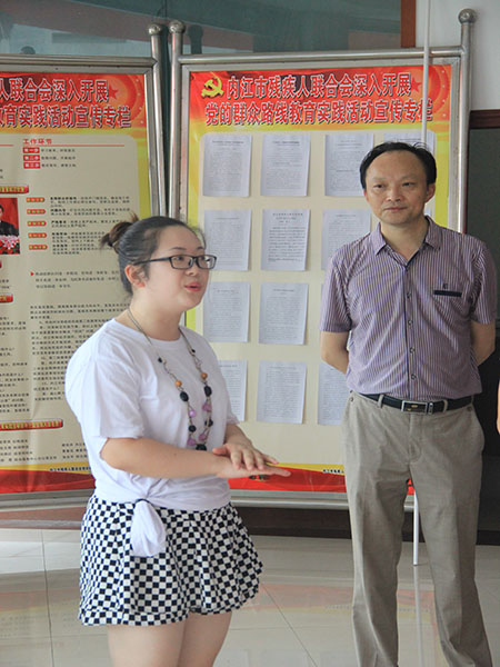2014年7月8日7点30分,太阳成集团tyc151cc“一米阳光”社会实践服务队的9名志愿者在辅导员刘津辰老师的带领下,迎着清晨的第一缕阳光前往内江市残联,展开了第一天的社会实践活动。7点50分,志愿者队伍到达了实践服务地点——内江市残疾人联合会。 8点整,开始了本次实践活动的启动仪式,由志愿者队员彭弋主持。市残联的龙书记,指导老师,工作人员,部分儿童及其家长参加了此次仪式。