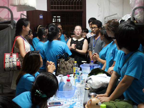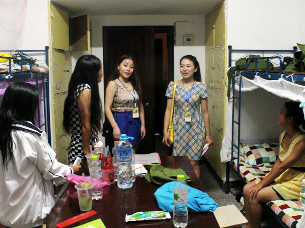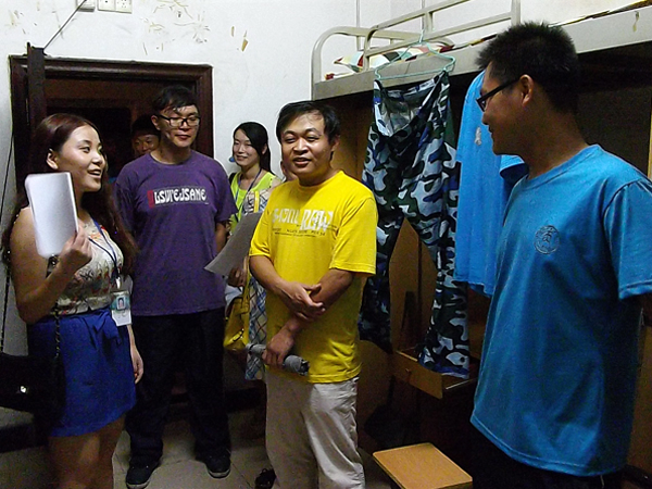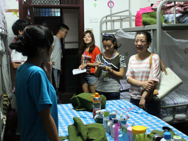 老师和师兄师姐们的到来受到了同学们热情真挚的欢迎,每走进一间宿舍,老师们都悉心询问每个同学的家乡、入校感受以及适应情况,同他们拉家常,并叮嘱大家在外面要好好照顾自己,军训期间更应注意各种人身财产安全问题。融洽的沟通让亲情般的关怀和温馨沁入每位同学心中。员工会主席李华也对新生在生活方面提出的问题一一进行了细致的答复和讲解,并嘱咐大家要注意宿舍的用电安全,排除安全隐患。同学们纷纷表示军训的体验对他们磨炼意志、适应老员工活有了很大的帮助,会好好珍惜军训的这段时光,并且会好好照顾自己,努力表现。