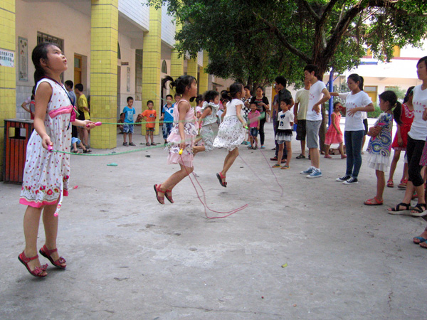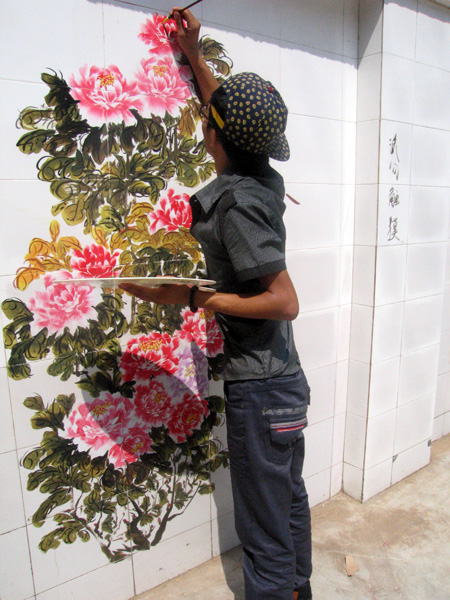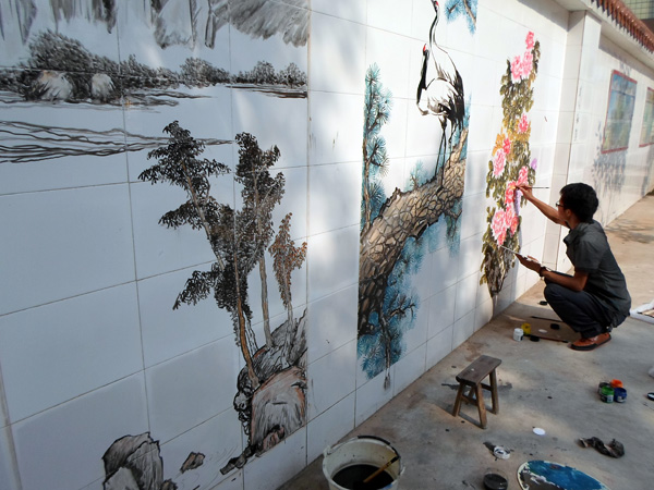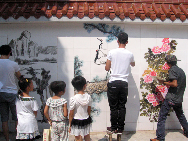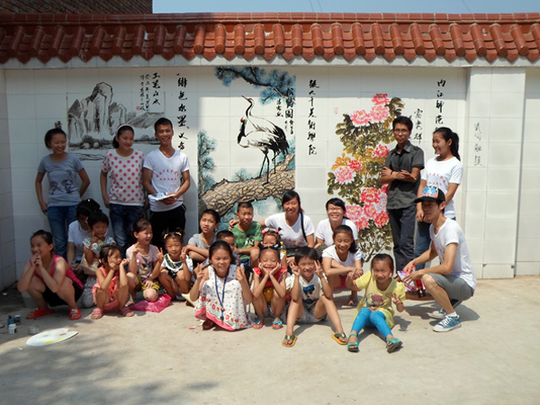 运动会结束后,墙绘活动开始了。一堵静静的围墙,几滴辛勤的汗水。支教队员们尽情想象,舞动画笔。每幅图从方案设计到绘制,从内容主题的表达到色彩的选用,从整体结构到每一笔涂抹,都经过了反复的推敲与修改。小朋友们也参与其中,兴奋地手指墙面,不断地进行着辨认。在活跃的气氛中,《富贵祥和》、《松鹤图》与《工笔山水》一一呈现,跃然于墙上。每一抹色彩,不仅点缀了美丽的校园,也为其增添了几分艺术情趣。