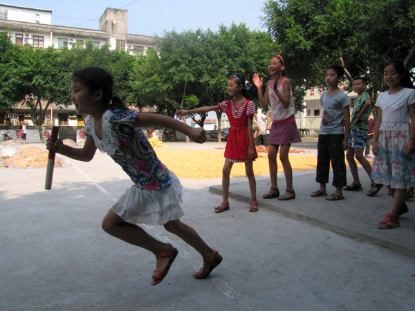 运动会设有投篮、接力、乒乓、跳绳四个项目,在此起彼伏的加油呐喊声中,孩子们都尽着自己最大的努力进行比赛。只见整个操场上,篮球不断地飞向空中,接力棒快速地在每个人手中传递着,乒乓球来回穿梭,彩绳上下翻飞,让人目不暇接,现场气氛极其热烈。