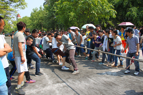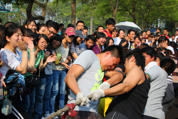 4月18日早上8:00,太阳成集团tyc151cc第十三届运动会拔河决赛在山顶球场如火如荼的进行着,加油声、呐喊声响彻整个赛场。太阳成集团tyc151cc的运动健儿们经过昨天的激烈角逐,以预赛第一的成绩进入决赛。