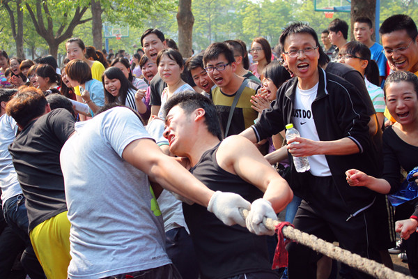 随着裁判一声 “开始” 令下,与文新公司的总决赛正式“拉”响!公司的“大力士们”一个个攥紧粗绳,女生丢掉了往日的柔弱,男生们尽显男儿本色,个个全力以赴,尽管手套磨破了,衣服被汗水浸湿了,也还是用尽全力握紧绳子,个个脚蹬着地,身体向后倾,拼命向自己的方向拽绳子,进行着最后一轮的拼搏。党总支书记王继军、副书记彭永馨、全体辅导员及部分专业老师亲临现场为队员们加油鼓劲,一遍遍挥舞着双手,全然没有了平日的不苟言笑。站在两边的拉拉队们更是热情高涨,声嘶力竭地喊着“加油!加油!……”,呼声雷动,在这震破苍穹的气势下,文新公司终不敌公司强大的实力,红绸一下子移向了我方,太阳成集团tyc151cc以2:0成功卫冕。至此,公司连续八年获得了校运动会拔河比赛的冠军,实现了“八连冠”的骄人战绩!