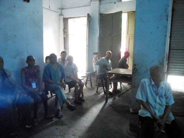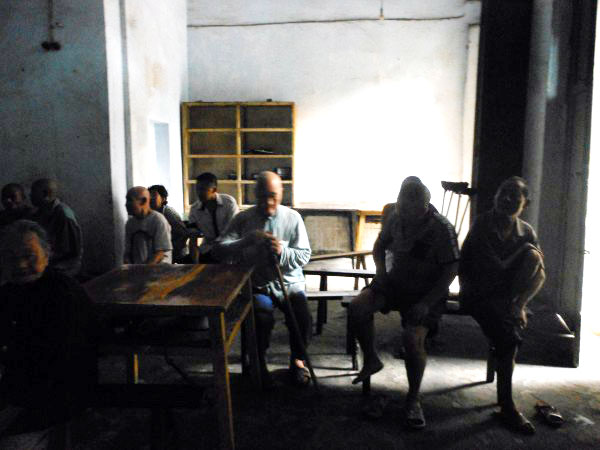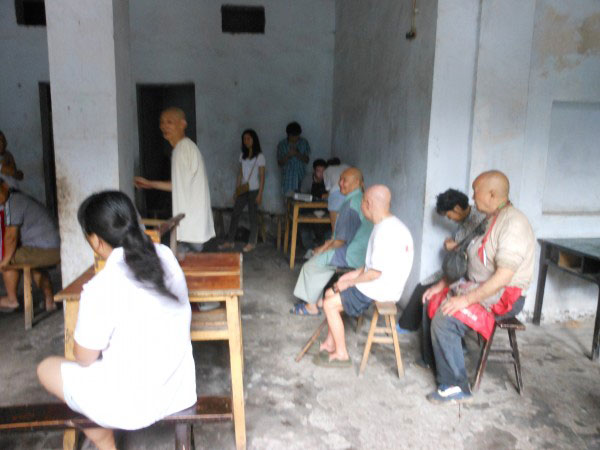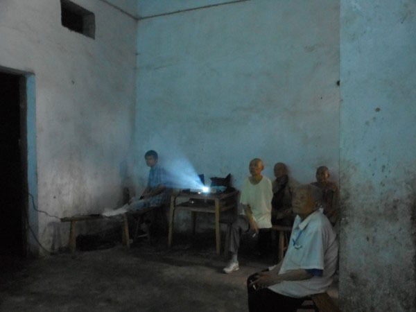 队员们把带来的电脑和投影放好位置,开始调试安装。还没安装好这个简小的客厅就坐满了老人,大家心情是迫不及待呀!这时老人们叫一个较年轻的大叔给大家伙先唱首歌,老人们管他叫“哈儿”,就是脑袋有点问题的人。这位“哈儿”大叔有点不好意思起来,腼腆的笑着,在众人的说哄下他还是站到前面给大家唱了起来,我听出他唱的是《谢谢你的爱》这首歌,虽然节奏有点不对,但是却真情流露,似乎表达他对院里人的一种感谢和他妈妈不离不弃,他妈妈也是在敬老院里,头脑有点问题,生活不能自理。我问及他歌是怎么学来的,他只是傻傻的笑着没回应我。